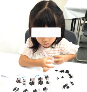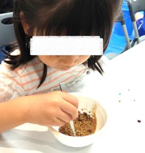 子どもたちが興味を持ったのは、「砂から宝石を見つける宝探し」「ブロックで作品を作る」「おしばなづくり」「タイム時計」など、きれいで作って楽しいものが中心。でも、これは、娘たち。